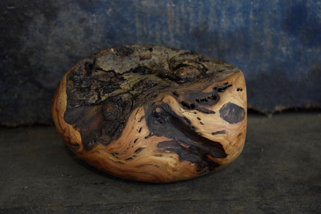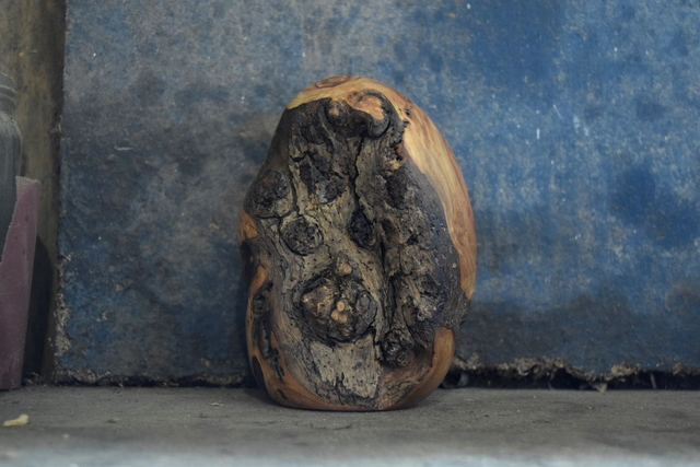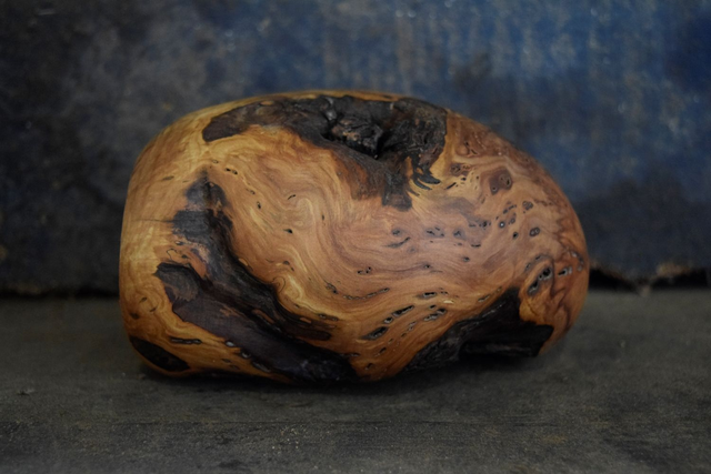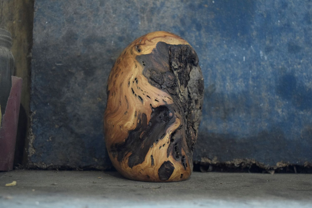 Œuvre d'art surnommée 'L 'œuf', taillée dans un bois de pommier vieux de 75 ans.