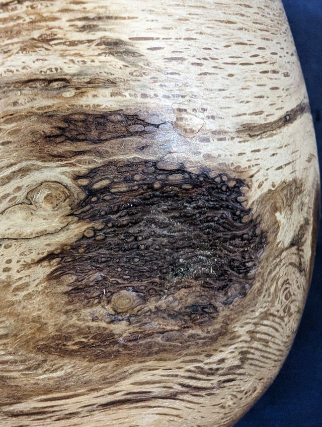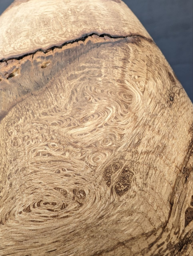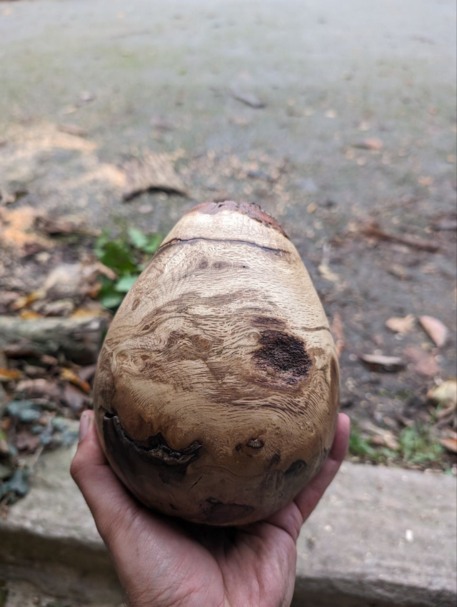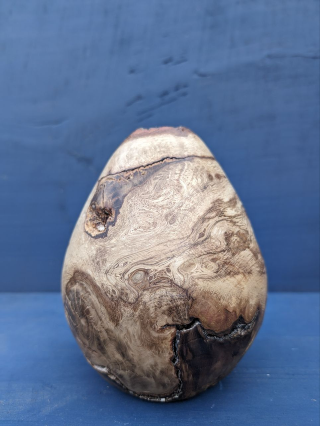 Œuvre d'art surnommée 'L 'œuf de dragon', travaillé dans du bois de chêne.